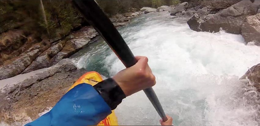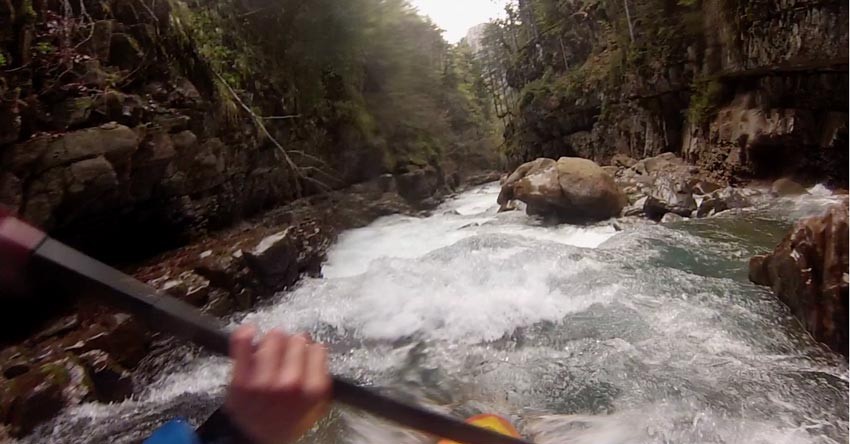 A partir de aquí el cañón se abre y todo se tranquiliza un poco. El río vuelve a coger desnivel y comenzamos la sección de las rampas. ¡¡¡esta primera parte es corta pero intensa!!! Poco después del paso que se ve en la foto anterior hacemos un porteo para evitar un infranqueable que sifona todo el río, aprovechamos para hablar entre nosotros y decidimos seguir bajando. Empezamos la segunda parte de la sección “rampas” ¡¡¡Esto se anima cada vez mas!!! Empieza con un pequeño drop fácil y algunas rampas que poco a poco van siendo mas largas y divertidas.